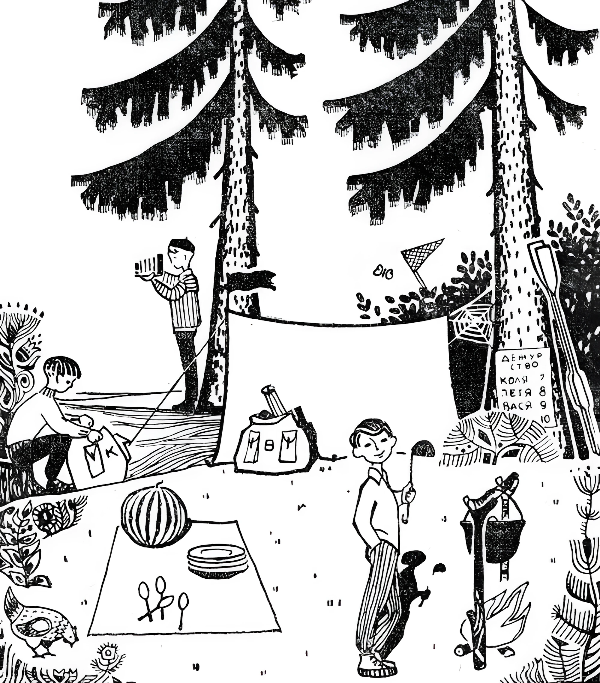 - Коля. Сегодня Коля что-то ищет в рюкзаке с буквой «К», Шура ловит бабочек, а Вася фотографирует природу (потому что из рюкзака с буквой «В» виден штатив от камеры).
