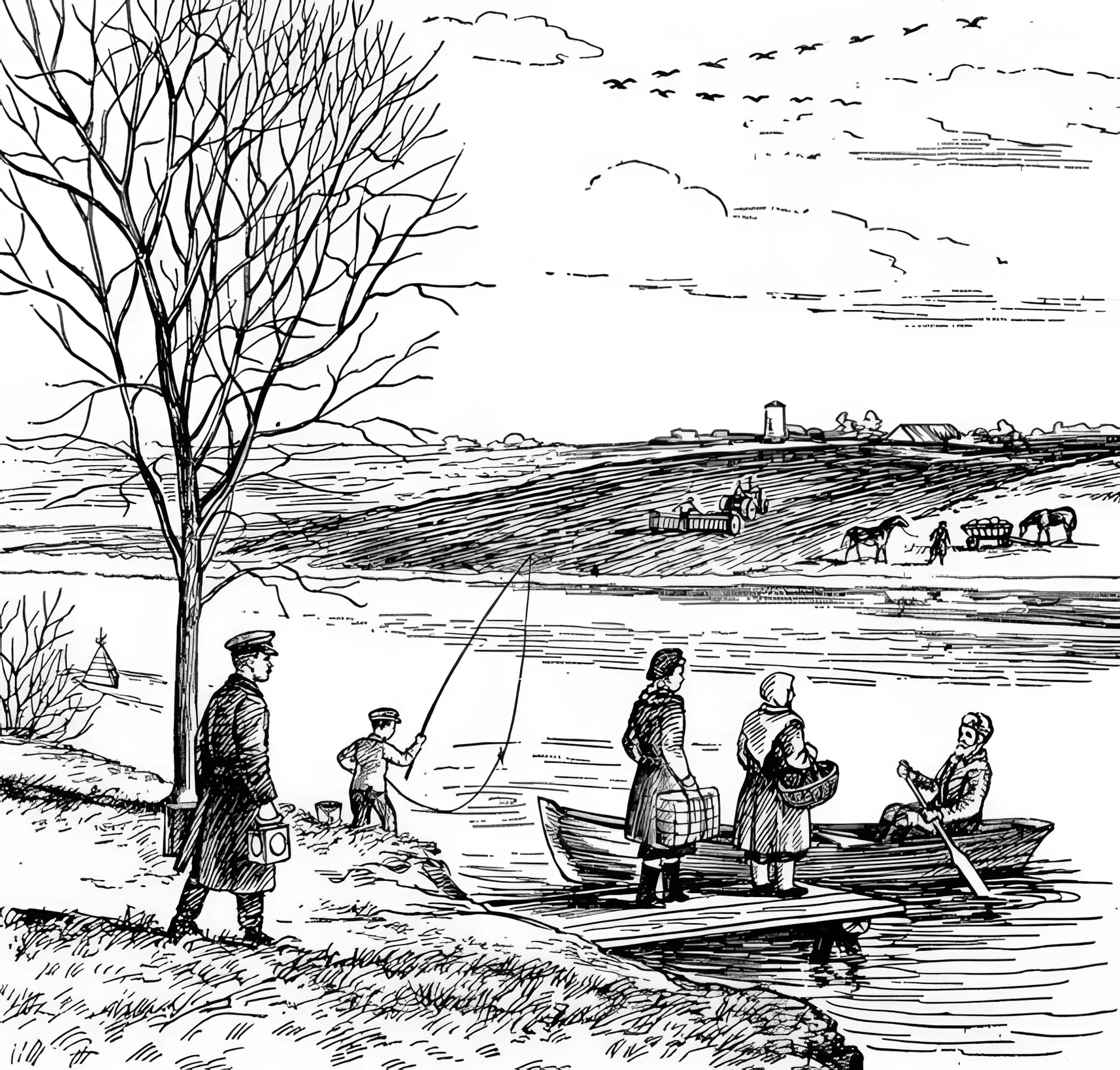 - Мостки и лестница, спускающаяся к реке, а также лодка с пассажирами показывают, что в этом месте налажен постоянный перевоз через реку. Он нужен здесь потому, что поблизости нет моста.
